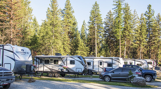 We made it safely to McGregor Lakes RV Park, 66 miles west of Glacier, on Thursday. The scenery on US 2 was beautiful. Many different things to see: mountains, wheat fields, rivers, forests, and scrub land. Even the small towns were interesting. The two lane road was smooth and the traffic was light in most places.